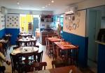Bacalhau, peixes grelhados e mariscos, mais carnes e vinhos, em restaurante português com decoração colorida.